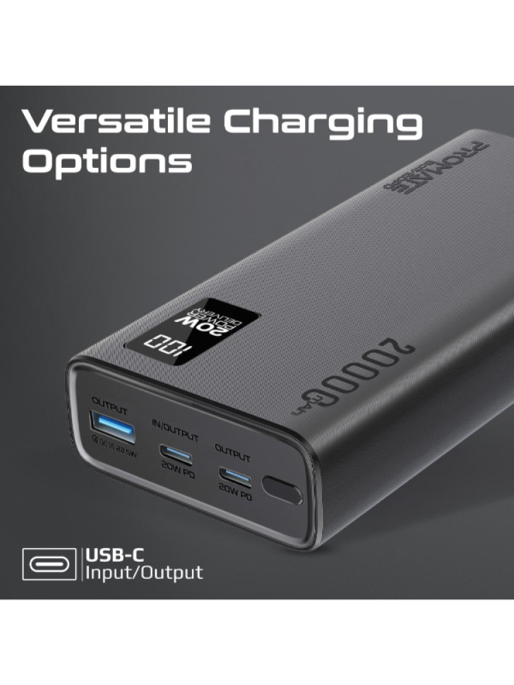 - قم بشحن هاتفك الذكي أو اللوحي الذي يتوافق مع USB-C™ باستخدام بوربانك Bolt-20PDمن شركة بروميت الذي يتضمن منفذ USB-C™ مخصصًا للشحن الفائق السرعة. مع منفذ للشحن وللخرج في نفس الوقت USB Type-C™ بقوة 20 واط، يمكنك شحن أجهزتك بالإضافة إلى شحن Bolt-20PD الخاص بك في آن واحد.