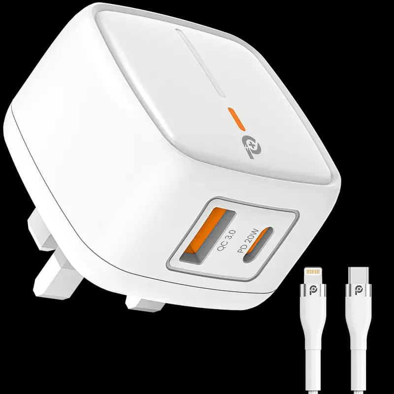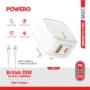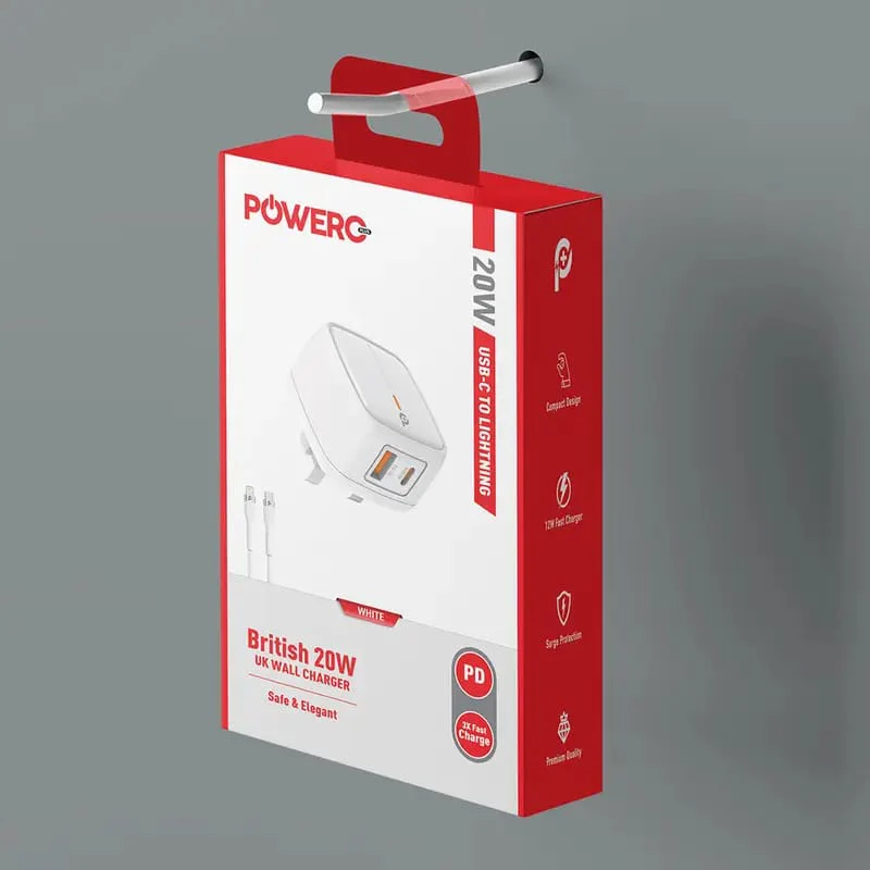 شاحن Powero+ بريطاني بقوة 20 وات مع كابل Lightning إلى Type C