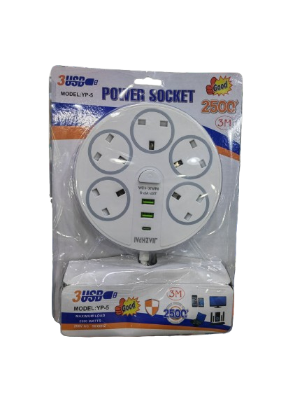 موزع كهربائي بقوة 2500 وات بطول 3 ممتر 5 فتحات 220 , 2USB , 1USB-C , ابيض